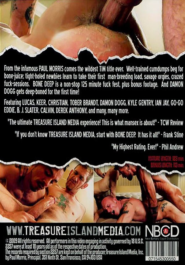 From the infamous PAUL MORRIS comes the wildest TIM title ever, BONE DEEP. Well-trained cumdumps beg for bone-juice; tight-holed newbies learn to take their first man-breeding load, mammoth cocks and cummy fists are crammed into gaping holes.