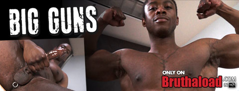 Big Guns got his name from both his impressive biceps and from that huge black cock and balls between his legs. He loves flexing and showing off as he rubs one out.