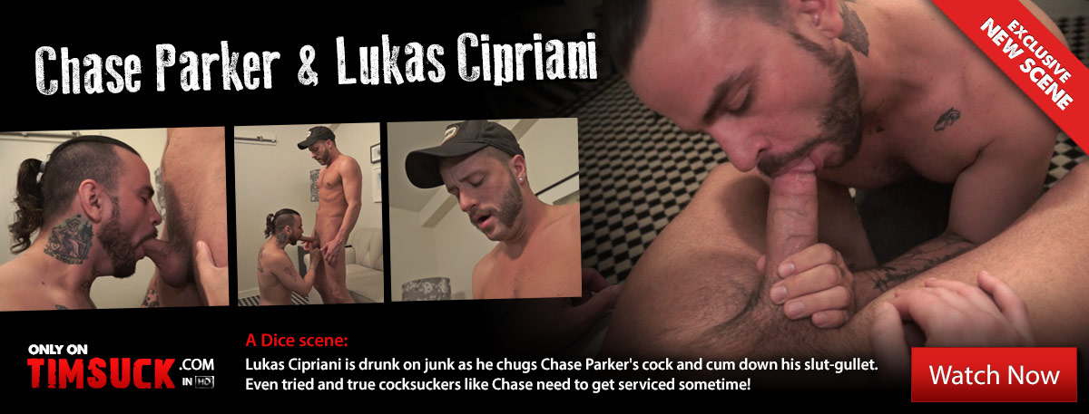 LUKAS CIPRIANI is drunk on junk as he chugs CHASE PARKER'S cock and cum down his slut-gullet.