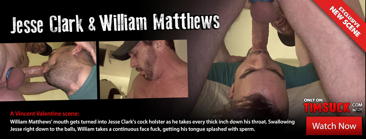 WILLIAM MATTHEWS' mouth gets turned into JESSE CLARK'S cock holster as he takes every thick inch down his throat.