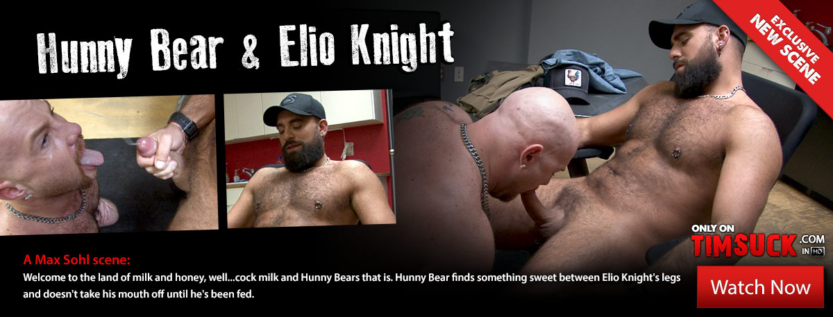 HUNNY BEAR finds something sweet between ELIO KNIGHT'S legs and doesn't take his mouth off until he's been fed.