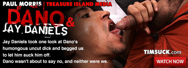 Jay took one look at Dano's humongous uncut dick and begged us to let him suck him off. Dano hadn't cum in a few days and was happy to let the young pup kneel for him. The eager lil' cocksucker makes a meal of Dano's cock and jizz load, filling his belly and leaving both men thoroughly sated.
