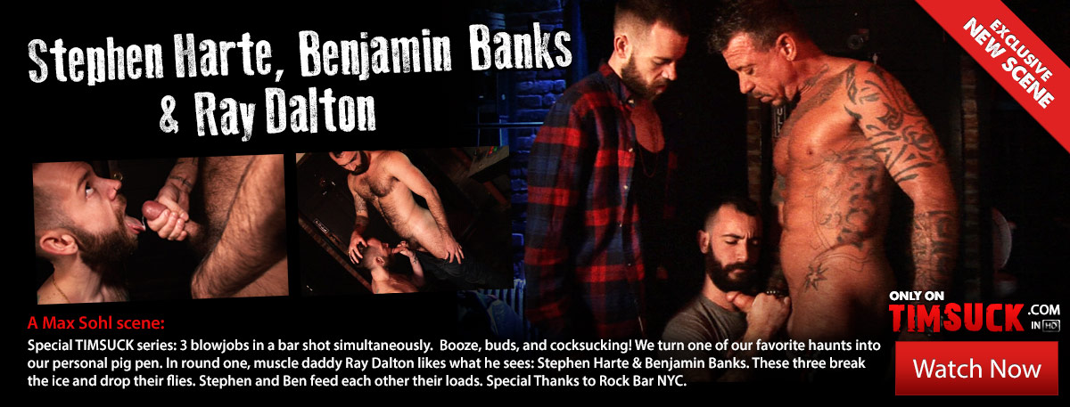 Booze, buds, and cocksucking! We turn one of our favorite haunts into our personal pig pen. In round one, muscle daddy RAY DALTON likes what he sees: STEPHEN HARTE & BENJAMIN BANKS.