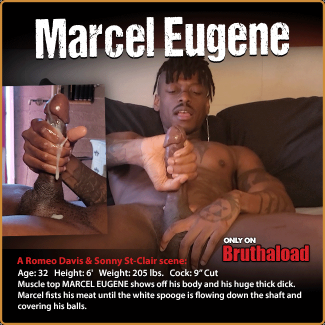 Muscle top MARCEL EUGENE shows off his body and his huge thick dick. Marcel fists his meat until the white spooge is flowing down the shaft and covering his balls.