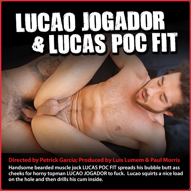 Handsome bearded muscle jock LUCAS POC FIT spreads his bubble butt ass cheeks for horny topman LUCAO JOGADOR to fuck. Lucao squirts a nice load on the hole and then drills his cum inside.