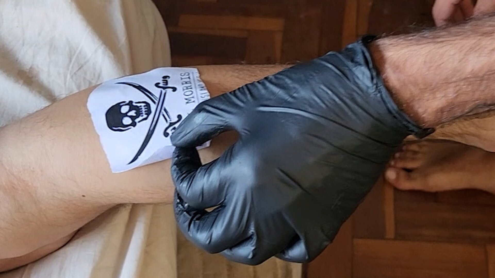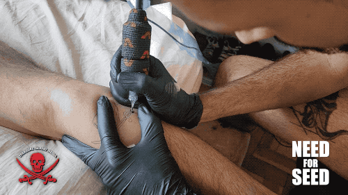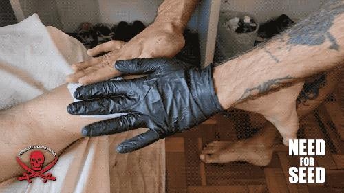 It worked. LUKAS KIRK can’t resist and tosses him down on the bed and fucks him before turning to the business of giving Lukas a Treasure Island Media logo tattoo on his leg.